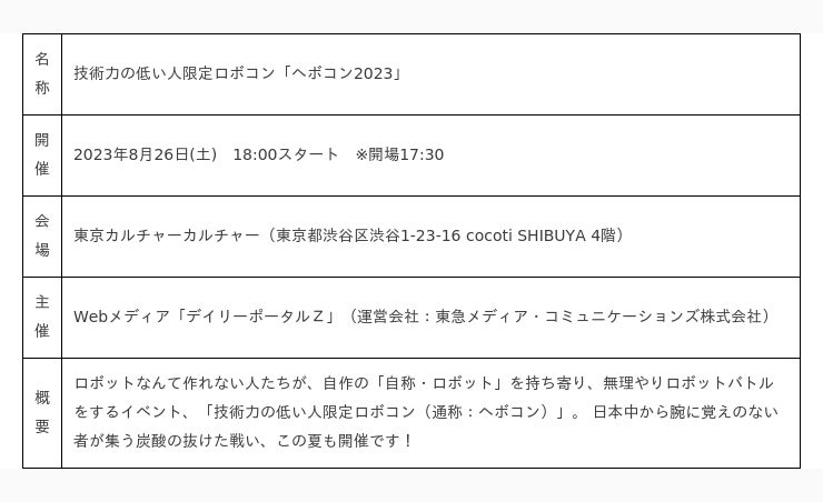 セメダイン株式会社(本社:東京都品川区、代表取締役会長兼社長:水澤伸治)は、昨年に続き、Webメディア「デイリーポータルZ」が主催する、技術力の低い人限定ロボコン「ヘボコン2023」に協賛し、技術力が伴わないがものづくりが好きな人たちを応援します。