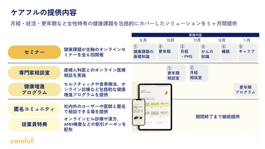 月経・妊活・更年期など女性特有の健康課題を包括的にカバーし、セミナー、専門家相談室、健康増進プログラム、匿名コミュニティなどを提供