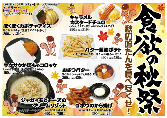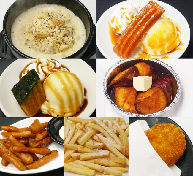 ジャガイモとチーズのクリームリゾットやキャラメルカスタードチュロ、あったかいカボチャにアイスを添えたスイーツやホクホクのさつまいものバターホイル焼、ゴボウのから揚げやバター醤油ポテト、カボチャのコロッケと秋の味覚満載です。