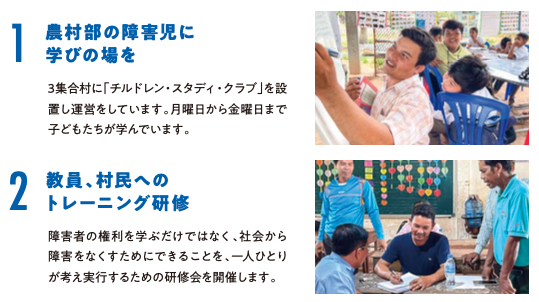 2021年からは、カンボジアの農村部に暮らす障害児が、集い、遊び、学ぶことができる教室「チルドレン・スタディー・クラブ」を3集合村で運営しています。