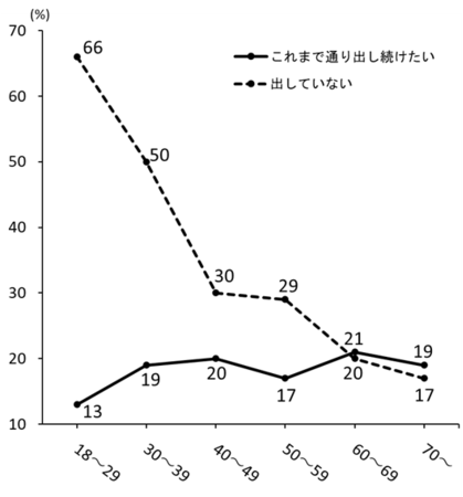 【図2】は、このうち「これまで通り出し続けたい」と「出していない」に関して、年齢別の比率をプロットしたものです。前者の「これまで通り出し続けたい」では、年齢差、すなわち「若低-老高」の構図を予想していたのですが、やや意外でした。それに対し、後者の「出していない」の比率にこれほど大きな相違があるのも想定外でした。18歳~29歳の66%や30代の5割といった高比率を、みなさんはどうお感じですか。