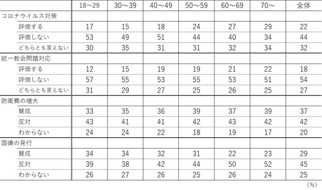 今度は、【表2】をご覧ください。【表1】で取り上げた四つの課題について、年齢別の評価をまとめました。コロナウィルス対策における「評価しない」の比率に「若高-老低」傾向が見受けられるものの、他の課題、すなわち、防衛費の増大や国債の発行などに関しては、全体における賛否の対立比率が各年代でも同じように存在することが確認できるでしょう。社会全体における意見対立と、賛成派、反対派、それぞれの内なる年齢を越えた共有認識、いささか気にかかる構図のようにも思えますが、解釈のしすぎかもしれません。