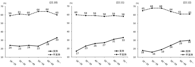 【図1】をご覧ください。年齢別の内閣支持率・不支持率を示しています。10月以降のここ三か月間、形状に大きな変化はみられないものの、支持率に関しては、18~29歳から40代までの年代で2割を下回りました。不支持率については全年代で6割を上回り、不支持と支持の開きは30代の52ポイントを最高に、最も小さい70歳以上でも31ポイントになりました。支持率が回復し、不支持率を上回るという状況への復帰は、かなり難しいと推測せざるを得ません。
