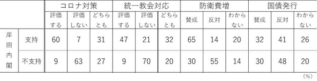 一方、表中の右側、「防衛費を大幅に増やすこと」や「(財源として)国債を発行すること」への評価をみると、前者については、内閣の支持層と不支持層との間で大小関係に逆転が存在していますが、後者に関しては支持層-不支持層間に大きな相違は存在していません。