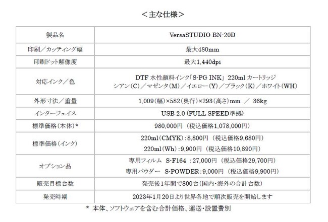 当社は、いち早くVersaSTUDIOというブランドで、このDTF転写ソリューションを提供することで、より多くのお客様にこの新しい手法にチャレンジいただき、創造性と競争力の高いビジネスを実現して頂きたいと思います」と述べています。