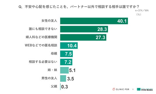 さらにパートナー以外で相談できる相手がいるかどうかを聞いたところ、「女性の友人(40.1%)」「婦人科などの医療機関(27.3%)」に相談している一方で、「誰にも相談できない」と回答した人も3割弱(28.3%)という結果となりました。