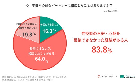 性交時に感じた不安や心配をパートナーに相談したかどうかについて聞いたところ、「毎回必ず相談した」女性は16.3%と、8割以上の女性が「パートナーに相談できなかった経験がある」という結果になりました。「相談したことはない(相談できなかった)」と回答した女性も2割弱(19.8%)おり、相談せずに悩みを抱えてる女性も一定数いることがうかがえます。