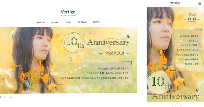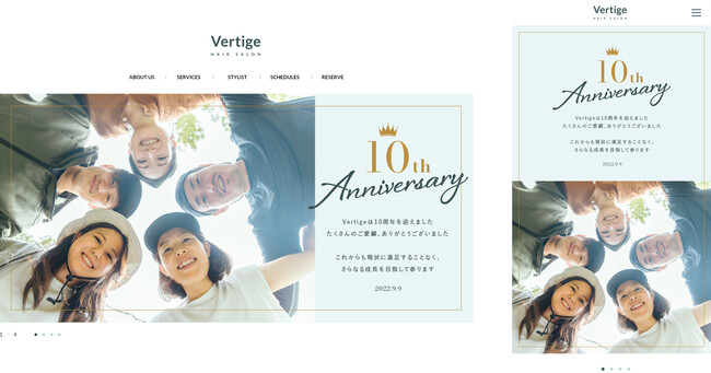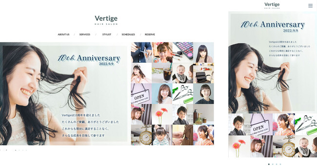 10周年ということで、過去のさまざまなシーンを切り取った演出は秀逸ですね。アットホームであったり、お客様を大切に考えている店舗のイメージが伝わります。メインとなる写真も内側に枠を入れトーンを変えているところも綺麗な仕上がりになっています。またスマートフォンでは、メイン写真の横に列数を変えてシーンの写真を並べる工夫が成功しています。素敵です。