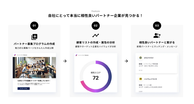 ハイウェイ上でパートナービジネスに取り組む企業がパートナープログラムを立ち上げ、ターゲット企業や顧客軸など事業シナジーの高い最適なパートナー企業の募集・検索が可能なプラットフォーム機能です。