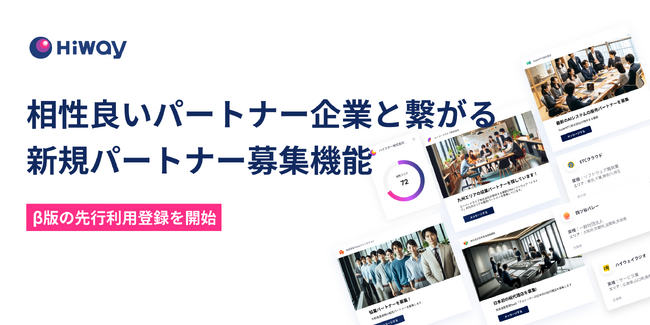 株式会社ハイウェイ(本社:東京都新宿区、代表取締役:久保文誉、以下ハイウェイ)が開発・運営する企業間営業連携クラウド「ハイウェイ」 は、パートナープログラムを立ち上げ自社にとって相性の良い最適なパートナー企業を募集できる「ニアバウンドプラットフォーム」機能のβ版の先行利用企業の事前登録を開始したことをお知らせします。