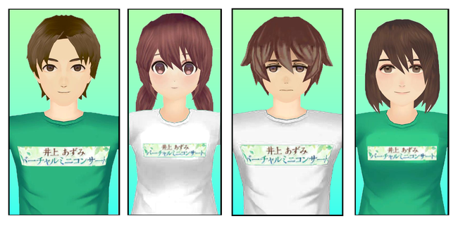 Tシャツには、「井上あずみバーチャルミニコンサート」の文字がプリントされており、コンサート会場内ならではの特別感と、参加者の一体感を感じていただくことが出来ると思います。実際のコンサート会場のようにお友達同士や会場内で知り合った方と、写真を撮っていただくなどもアプリ内機能を使って、お楽しみいただけます。