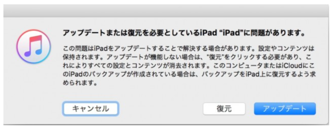 2、iPhoneがリカバリーモードになるとiTunesに「アップデートまたは復元を必要としているiPhoneに問題があります」と表示されるので「復元」をクリックします。