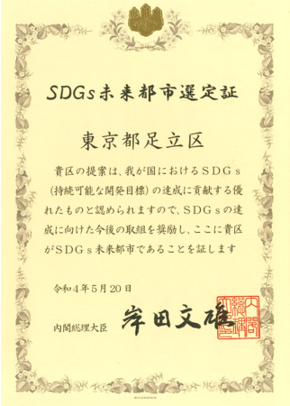 足立区は、令和4年5月20日、国(内閣府)からSDGs達成に向けた優れた取組みを提案した自治体に認められる「SDGs未来都市」に選定されました。同時に、特に先導的な取組みとして毎年度10都市のみ選定される「自治体SDGsモデル事業」にも選定されました。