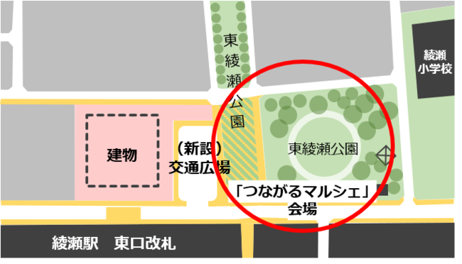 駅前広場と東綾瀬公園の一体的整備に合わせて、地域に賑わいと交流を生み出すマルシェを開催します。