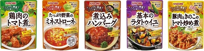 左から「鶏肉のトマト煮用ソース」「たっぷり野菜のミネストローネソース」「煮込みハンバーグ用ソース」「基本のラタトゥイユ用ソース」「豚肉ときのこのトマト炒め煮用ソース」