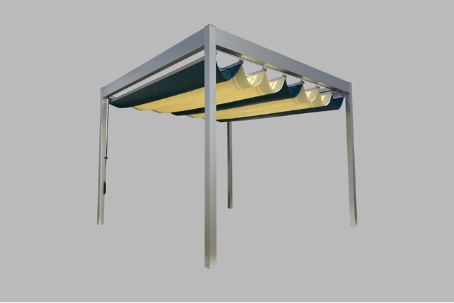 凹凸のないスマートなアルミ製パーゴラと、継ぎ目のない可動部が、美しくキャンバスを引き立てる、景観に馴染むデザインです。