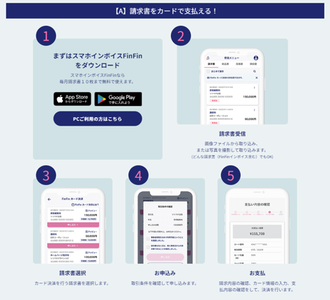「FinFin カード決済」はスマホインボイス FinFin で受領した請求書を PC ・スマホから指定して申し込むだけで、利用可能なサービスです。