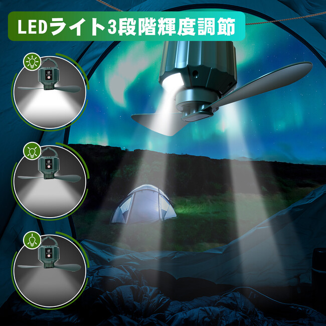 【LEDライト3段階輝度調節】LEDライトが付いて、ライトの輝度も3段階調節可能で、キャンプやアウトドアイベントに最適なアイテムです。昼間は扇風機として使い、夜は暗い場所をライトで照らすことができます。 停電時、災害の時に非常用の灯りとしてご使用いただけます。