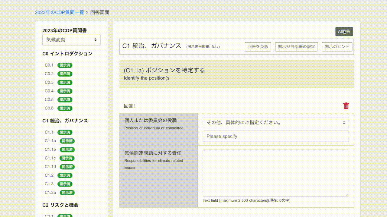 外部評価機関から回答を要求される質問事項は、量もさることながら基準が曖昧なものが多く、回答が困難なケースがあります。さらに、多くの質問書が英語で構成されている点も、回答の心理的なハードルとなっています。estomaでは、質問を日本語に翻訳され、かつ、全ての質問にガイダンスや回答の要点がまとまっているため、効率的な回答作業を実現します。
