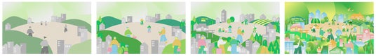 当社は創業以来、「景観10年、風景100年、風土1000年」という考え方を大切にしています。これは、まず景観を整え、その景観が人と共生しながら風景として土地になじんでいく。やがて人の営みが深まり、歴史と文化が育まれて風土を形成していく。そんな時の流れを願い、景観・風景・風土を次世代に残していくことが、当社の使命だと考えています。コーポレートサイトでは、そんな時の流れの中で「Well-green World」を追求し続ける当社の姿勢を、移り変わるイラストとTOPページのキービジュアルで象徴的に示しています。