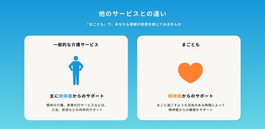かつては、高齢者の身体的健康への支援は家政婦や介護サービスが、精神的健康への支援は家族が担うという役割分担が存在していました。しかし現代では、核家族化や共働きの進展により、家族による十分な精神的ケアが困難となり、高齢者支援は身体的ケアに偏りがちになっています。『まごとも』は、従来のように介護効率を追求するのではなく、高齢者の心の元気を引き出すことに重点をおいたサービスとなっています。