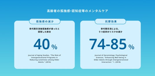 高齢者が若者と交流することで、うつ病のリスクが約80%低下し、孤独感も40%軽減されるという研究結果が報告されており、世代間交流の価値は科学的にも実証されています。
