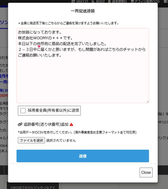 商品の出荷完了後、配送業者から出力された「出荷データCSV」をWoomyの管理画面(一斉配送連絡フォーム)に添付して送信するだけで、各インフルエンサーに対して個別の追跡番号が紐づいた発送完了メッセージが自動で送信されます。宛先と追跡番号を手作業で照合し、個別に連絡する手間は一切不要です。上記対応のフォーマットから出力した出荷データには対応しております。