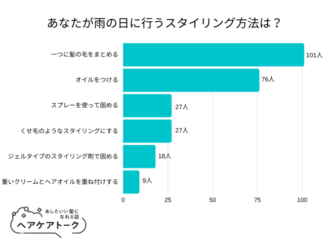 「あなたが雨の日に行うスタイリング方法は?」とアンケート調査した結果、1位は『一つに髪の毛をまとめる』でした。