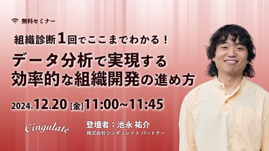 信頼の科学とデータサイエンスで組織開発を支援する株式会社シンギュレイト(本社:東京都渋谷区、代表取締役:鹿内 学、以下シンギュレイト)は、「組織診断サーベイ1回でここまでわかる!データ分析で実現する効率的な組織開発の進め方」を2024年12月20日(金)11:00~11:45で開催します。