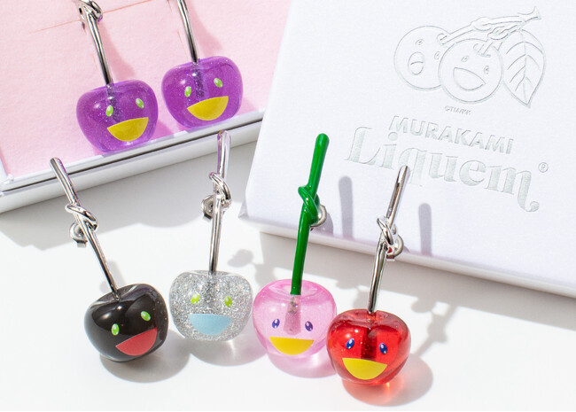 村上隆さんとのコラボチェリーは、初のプリント仕様。特徴的な「お顔」や目の採光も表現しています。カラーバリエーションは5つで、古典的なレッド、近未来的なパープル、カラーレスなシルバー、クールなブラック、そして柄をグリーンで塗装した特別なピンクです。