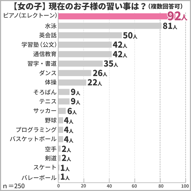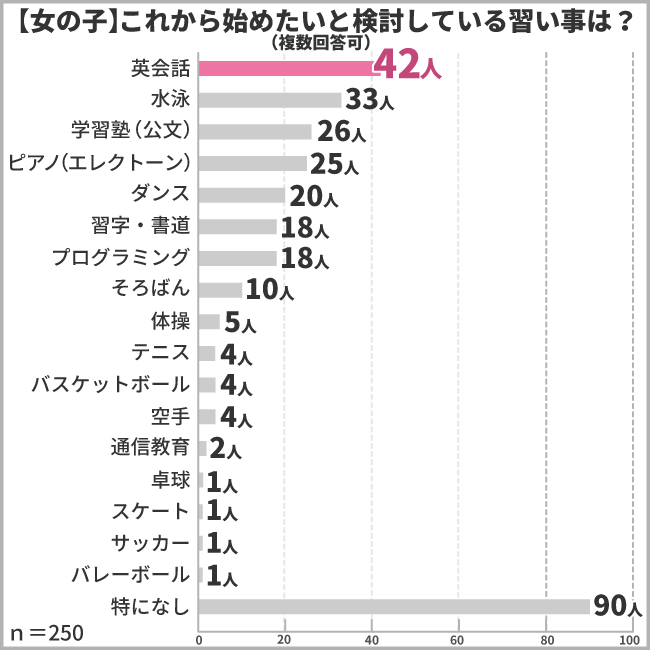 女の子に人気の習い事第1位は「ピアノ(エレクトーン)」、次に男の子にも人気だった「水泳」「英会話」「学習塾」と続きました。
