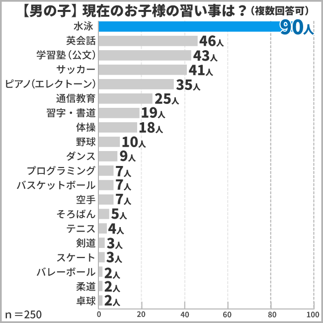 これから「人気の習い事」や「習い事にかける費用」など、「男の子のお子様の保護者」250人と「女の子のお子様の保護者」250人、合計500人のアンケート結果をご紹介していきます。