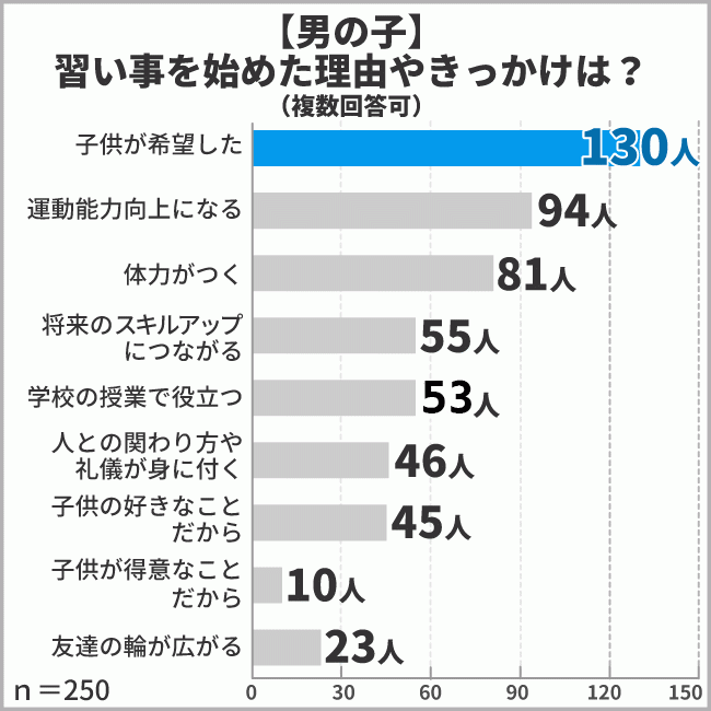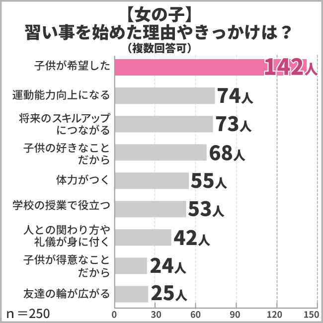 第3位以降は男の子の保護者の方と女の子の保護者の方で結果は異なりますが、習い事を始めた「きっかけ」の一番の理由は「子供の意思を尊重している」結果となっています。