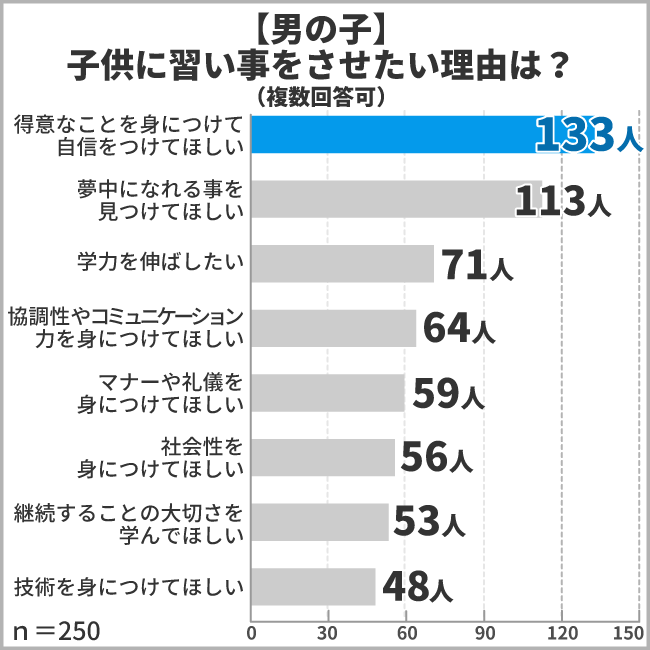 子供に習い事をさせたい理由は、男の子の保護者の方も女の子の保護者の方も「得意なことを身につけて自信をつけてほしい」が第1位の結果となりました。