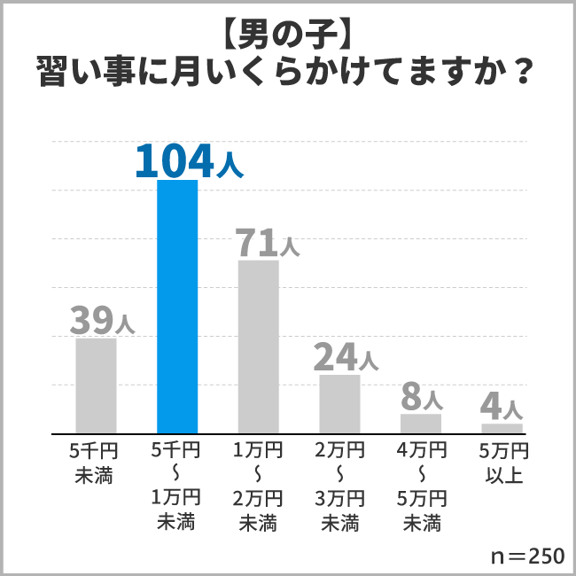 男の子も女の子も通わせている習い事の数は「1つ」が一番多い結果となっています。気になる費用についても聞いてみました。皆さんは一体習い事に月いくらぐらい使っているのでしょうか。