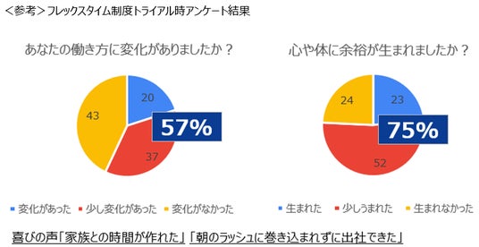 コアタイムを無くす制度拡充に向けて2024年2月からトライアルを実施し、繁忙期でもリスクなく活用できるかを検証しました。その際のアンケート結果から繁忙期ではない時期と同様、大きなリスクがなく制度が活用されました。また社員の60%が繁忙期中にフレックスを利用し、繁忙期の方が多く活用されていたことがわかりました。このことから自身で裁量権をもてたことで仕事の調整ができたことが推察できます。また昨対比の実績から長時間労働の削減にも副次的に効果があったことが分かりました。