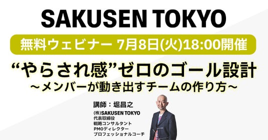 マーケティング最適化、新規事業開発、企業文化変革、組織変革、BPRなど、企業の様々な“変革”プロジェクトに並走するPMOカンパニー、株式会社SAKUSEN TOKYO(本社所在地:東京都渋谷区、代表取締役:堀昌之、以下SAKUSEN TOKYO https://sakusentokyo.com/)は、2025年7月8日(火) 18:00より、自社主催の無料ウェビナー「“やらされ感”ゼロのゴール設計 ~メンバーが動き出すチームの作り方~」を開催いたします。6月25日より申込受付を開始いたしました。
