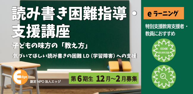 東京都港区の認定NPO法人エッジ(会長:藤堂栄子)は、読み書きの困難がある子どもたちへの学習支援を実践的に学べるeラーニング、【読み書き困難指導・支援講座】第6期を2023年12月1日に開講します。
