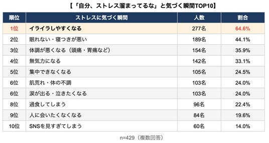 その結果、「自分、ストレス溜まってるな」と気づく瞬間として最も多かったのは「イライラしやすくなる」(64.6%)で、2位「眠れない・寝つきが悪い」(44.1%)、3位「体調が悪くなる」(35.9%)と続きました。心と体の両面にストレスのサインが現れることが明らかになりました。