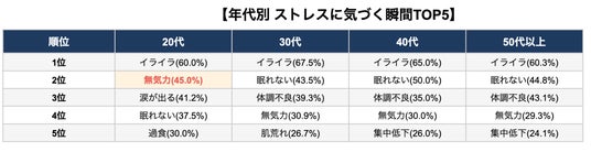 ~ストレスサインに関する意識調査~1位「イライラしやすくなる」64.6%、2位「眠れない」44.1%女性は「涙が出る」、20代は「無気力」性別・年代で異なるストレスサイン