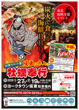 宮城県石巻の牡蠣をセルフ炭火焼き(海鮮BBQ)で楽しむ「出張カキ小屋 牡蠣(かき)奉行」(TEL 070-3270-3210)がヨークタウン坂東(茨城県坂東市)に期間限定オープン。期間は1月27日~2月19日