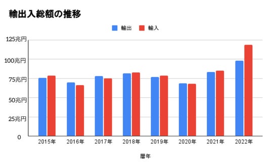 (出典:財務省貿易統計 年別輸出入総額)