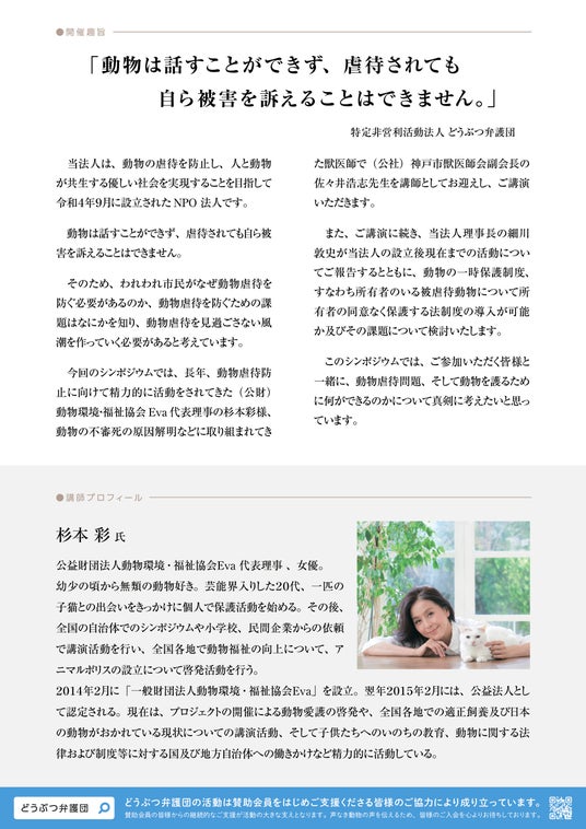 - 会場参加のみ (録画配信については、当日の様子に加え、シンポジウム後に予定している杉本彩様と当法人理事長らの対談の様子を録画した動画を、後日賛助会員様向けにご案内いたします。)