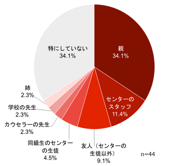 相手 は「親」が34.1%で最も多く、次いで「センターのスタッフ」が11.4%でした。やはり子どもにとって親の存在が大きい一方、スタッフや友人含め親以外に相談している割合をまとめると31.8%となりました。