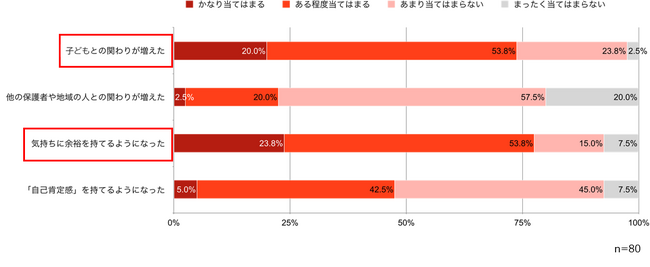 保護者の変化で、「気持ちに余裕を持てるようになった」が77.6%、「子どもとの関わりが増えた」が73.8%。