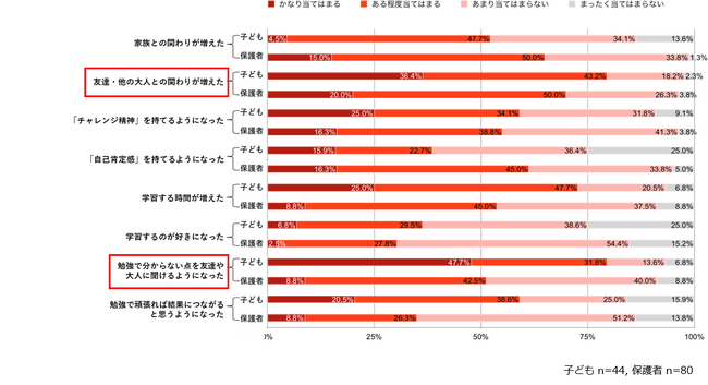 「勉強で分からない点を友達や大人に聞けるようになった」子どもが79.5%、「友達・他の大人との関わりが増えた」子どもは79.6%。学習が好きになった理由として、「学びの実感」や「みんなが勉強しているという周囲の刺激があるから」。