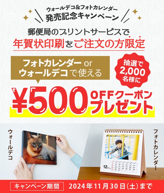 2024年11月30日までに年賀状印刷や喪中はがき印刷をご購入いただいたお客様の中から、抽選で2000名様に「ウォールデコ」または「フォトカレンダー」が 500円OFFになるクーポンが当たるキャンペーンです。