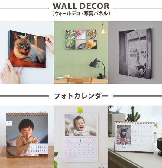自分で撮ったお気に入りの写真を使ってお部屋の壁に飾れる「WALL DECOR(ウォールデコ/写真パネル)」や、1枚ずつ写真を選んで作れる「フォトカレンダー」を販売中です!