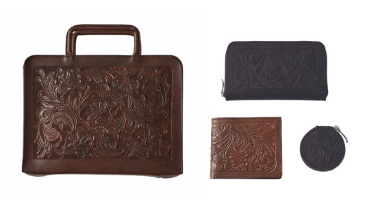 (左から)HAND CARVED LEATHER 天国と地獄 BRIEFCASE BY KICHIZO COLOR : BROWN / PRICE : ¥242,000 HAND CARVED LEATHER 天国と地獄 LONG WALLET BY KICHIZO COLOR : BLACK / PRICE : ¥126,500 HAND CARVED LEATHER 天国と地獄 WALLET BY KICHIZO COLOR : BROWN / PRICE : ¥82,500 HAND CARVED LEATHER 天国と地獄 COIN CASE BY KICHIZO COLOR : BLACK / PRICE : ¥66,000 *展開商品の一部です