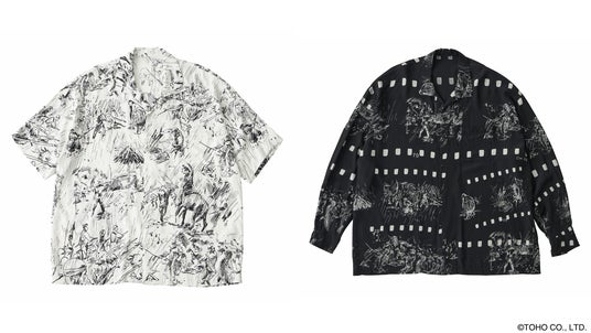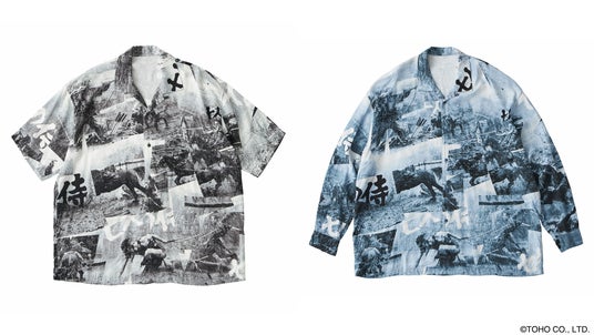 (左)ALOHA SHIRT 七人の侍 PC ORIGINAL ILLUSTRATION COLOR : WHITE / PRICE : ¥57,750 (右)ALOHA LONG SHIRT 七人の侍 PC ORIGINAL ILLUSTRATION COLOR : BLACK / PRICE : ¥64,900 *展開商品の一部です